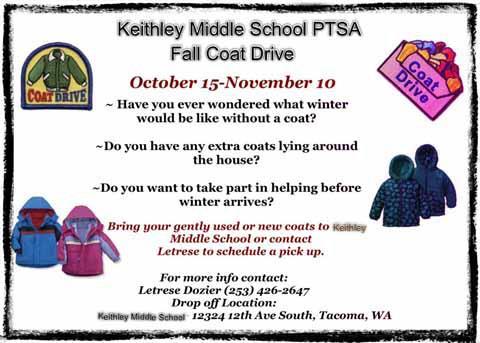 Keithley Middle School’s PTSA would appreciate your help in wrapping their students in warmth with new or gently used coats. We are seeking donations in the month of November. Items can be dropped off at Keithley Middle School, 12324 12th Ave. S., Tacoma (Parkland).