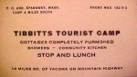 Great granddaughter Anne Tibbitts Reitzug showed off an old business card for Tibbitts Tourist Camp, 4 miles south of the Spanaway Post Office. “14 MILES SO. OF TACOMA ON MOUNTAIN HIGHWAY.“ The phone number was MAD 162 R 3. The card advertised completely furnished cottages, showers and a community kitchen. STOP AND LUNCH was in large letters.