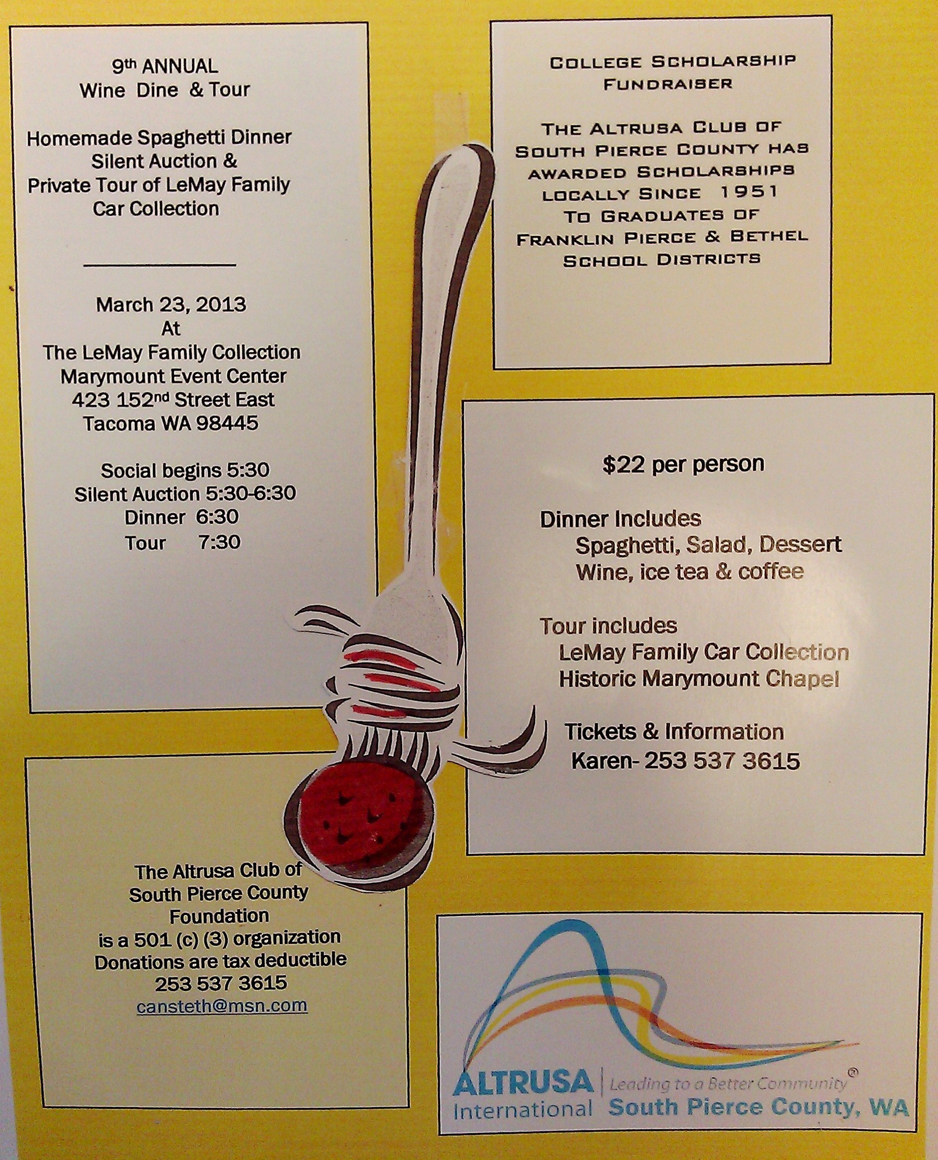 Altrusa of South Pierce County’s 9th Annual Wine, Dine & Tour will take place on March 23, 2013 at the Marymount Event Center. The event consists of a spaghetti dinner with Nancy’s LeMay’s special sauce, a silent auction and a private tour of the LeMay Family Car Collection.