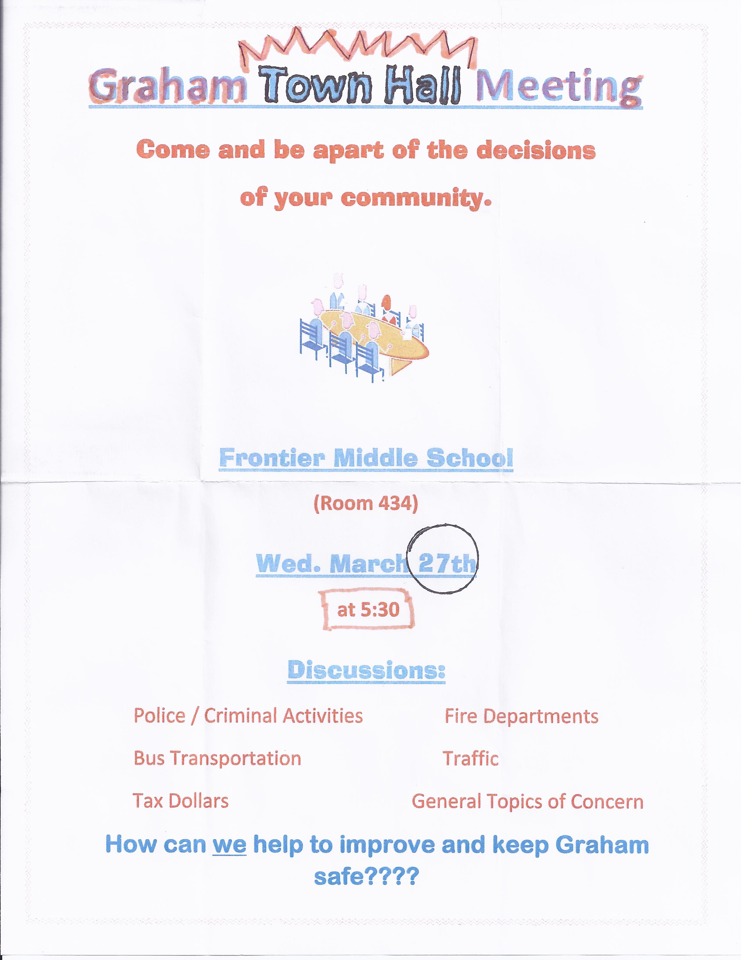 There will be a Graham Town Hall Meeting at Frontier Middle School on March 27th at 5:30 p.m., room 434. The purpose is to discuss how to improve and keep Graham safe.