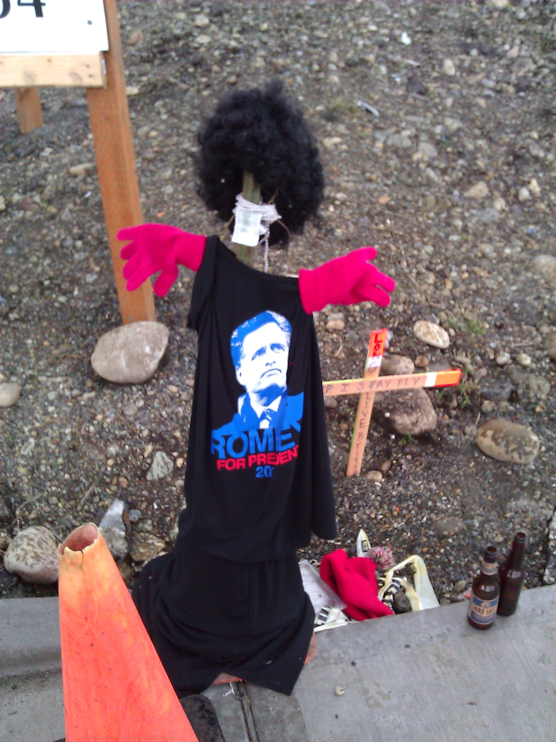 Sunday, in its place are two survey stakes nailed in a cross that say, “RIP I Stay Fly” and “Long Live Britt.” In place of the white T-shirt, there is a pair of gloves, a string of pearls around its neck (?), a black Romney 2012 T-shirt, a couple empty beer bottles, a red stocking cap and the other shirt on the ground. With no idea who is placing these there or the intriguing story behind them, stay tuned for what is placed there tomorrow…