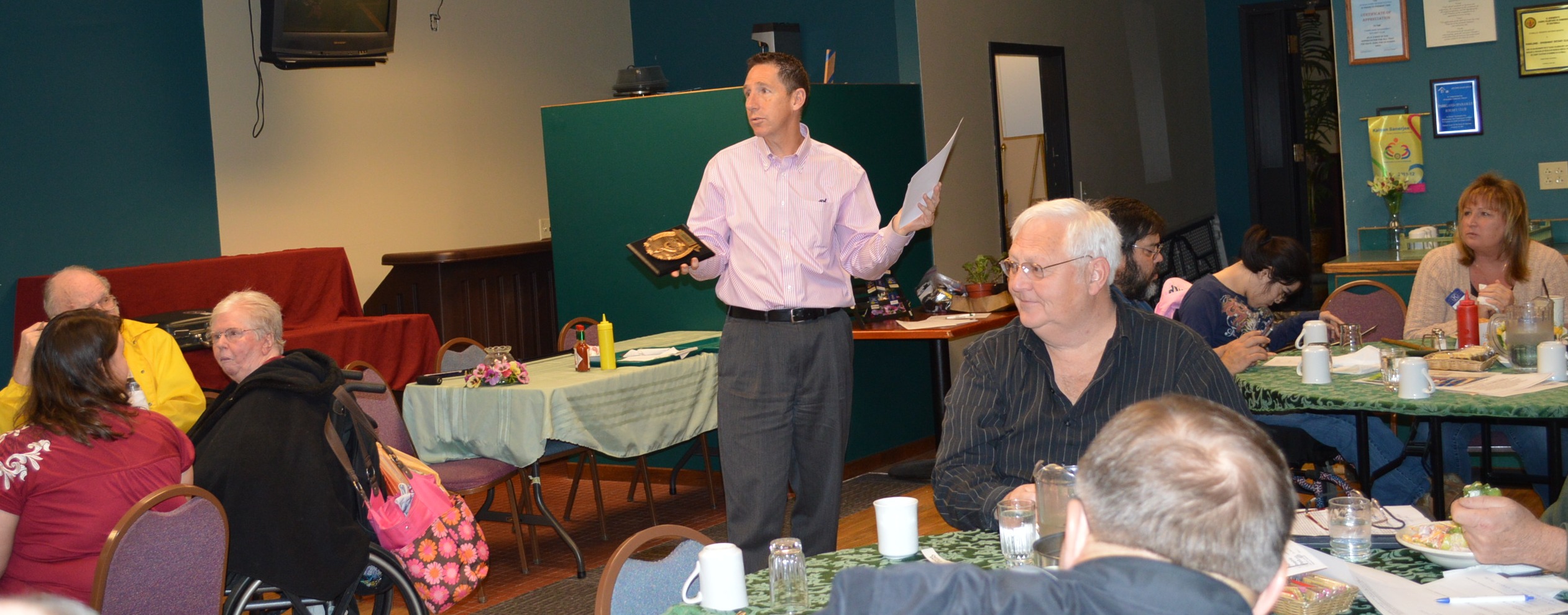 In the photo, Jay Brower, Bethel Community Connections Director shows the Parkland Spanaway Kiwanis Club the award that was received by the district for their Daffodil Float entry.