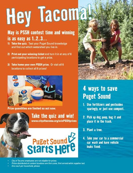 1) Take the Puget Sound quiz and find out which watershed you live in – go to www.cityoftacoma.org/winPSSHprizes to take the quiz.