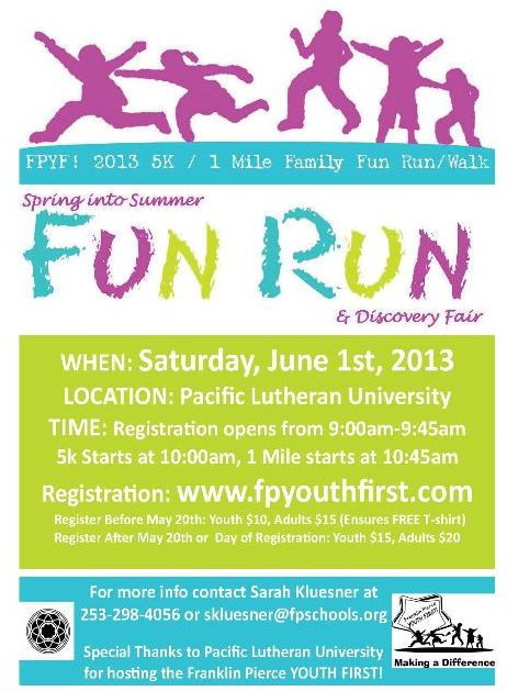 FRANKLIN PIERCE SCHOOL DISTRICT — On Saturday, June 1, Franklin Pierce Youth First! invites you to participate in the 2013 5K/1 mile Family Fun Run/Walk and Discovery Fair.