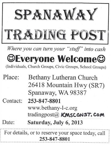 Bethany Lutheran Church is having a yard/parking lot sale that they are calling the Spanaway Trading Post. Bethany was founded in 1898 and serves the Eatonville, Spanaway, Roy and Graham communities. Their website is https://bethany-l-c.org/.