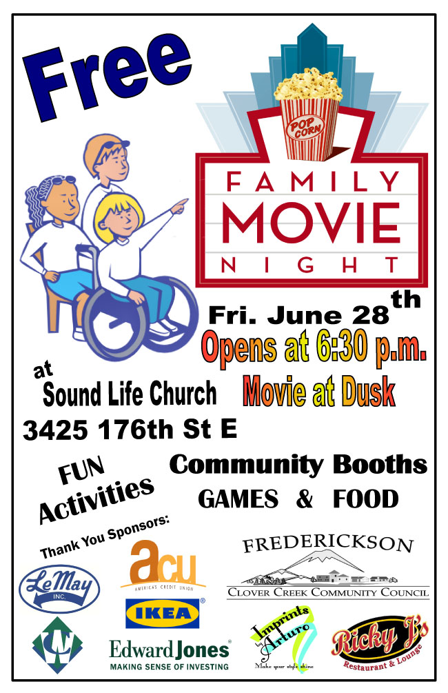 DSC_2040Friday night, June 28, 2013, the Frederickson Clover Creek Community Council will hold one of its Family Movie Nights outdoors at Sound life Church on 36th Ave E. and 176th Street.  The event will begin at 6:30 pm with vendor booths, food and games for the family. At dusk, the movie “The Lorax” will be shown.