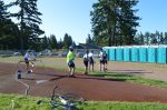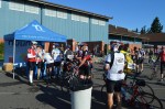 I met Danielle and Brett’s parents, children and Bernese Mountain dog patiently waiting for them at the school. Another woman had a large distinctive mylar balloon on her car to help her 3 family members spot her. The morning started off as early as 4:45 a.m. for the first riders out of the gate. Riders depart Seattle every 10 minutes after that. In Spanaway it was as low as 42 degrees int he early morning. Although the riders worked up a sweat, one noted he was still rather cold.