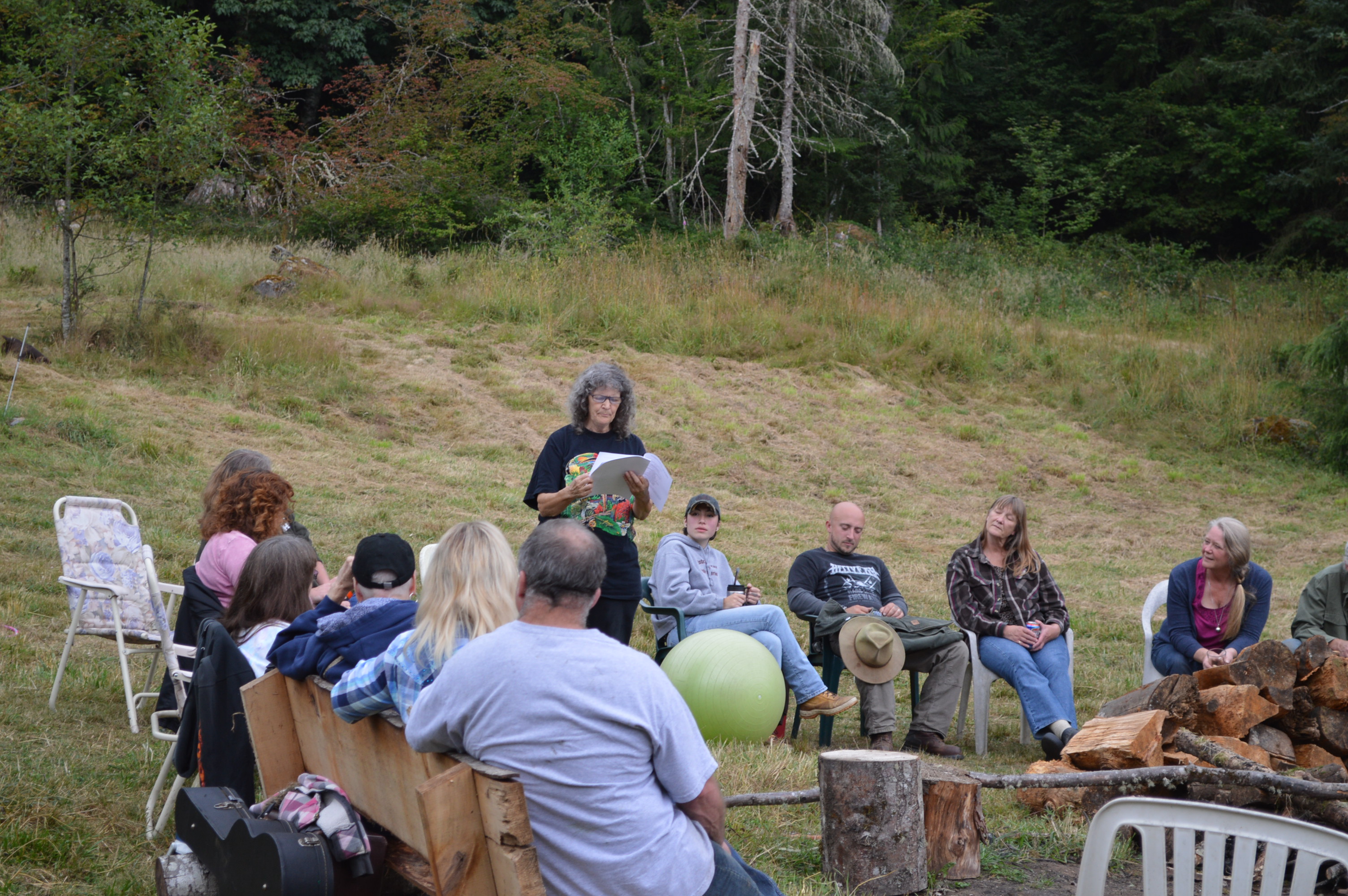 “In the 90’s, the logging was intense in an effort to beat the impending federal salmon plans. So in 1998, when they logged above the bridge, we began to meet. Mowich Mick began pushing us to get in their faces because it seemed as though asking nicely and their ‘promises’ were not going to work. We demanded a one-mile-no-spray-zone around our houses after they over-sprayed onto our properties twice, citing ‘operator error’ both times. These sprays are a combination of several toxins similar to agent orange and are known to cause many health problems, including miscarriages. When there was no breeze, the smell would hang in our little 10-mile long valley for days and you could taste it in your mouth. They spray several times each year for the first few years. It kills every living thing, plants, seeds, bugs. It took nearly 10 years for the wildlife to come back. During that time, there was no bugs, no bees, no birds, no frogs, no coyotes were singing, no deer were here. The valley was dead. Apples in the old town of Fairfax laid on the ground from fall to spring uneaten. It was a dark time in our rainforest.”