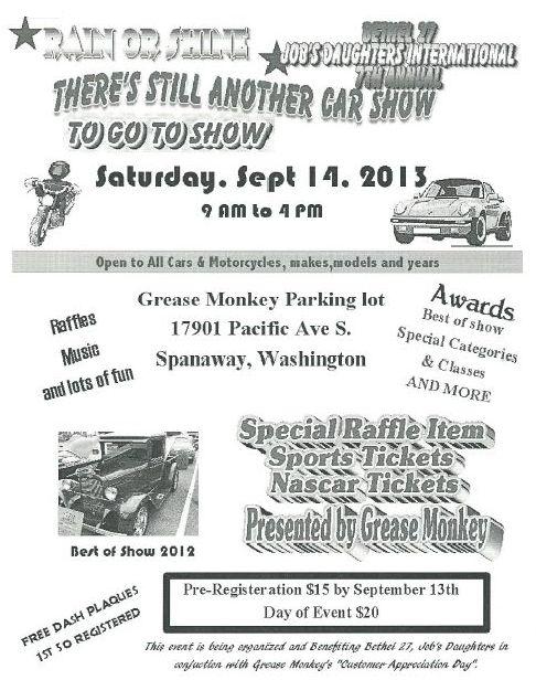 SPANAWAY, WA. – Anyone who enjoys cars – from backyard tinkerers to die-hard enthusiasts – are invited to a special auto show to benefit Bethel 27, Job’s Daughters International. On Saturday, September 14th Bethel 27 will present the seventh annual “There’s Still Another Car Show To Go To Show” at Grease Monkey, 17901 Pacific Avenue South, Spanaway, WA. The event will be held from 9 a.m. to 4 p.m. Rain or shine.