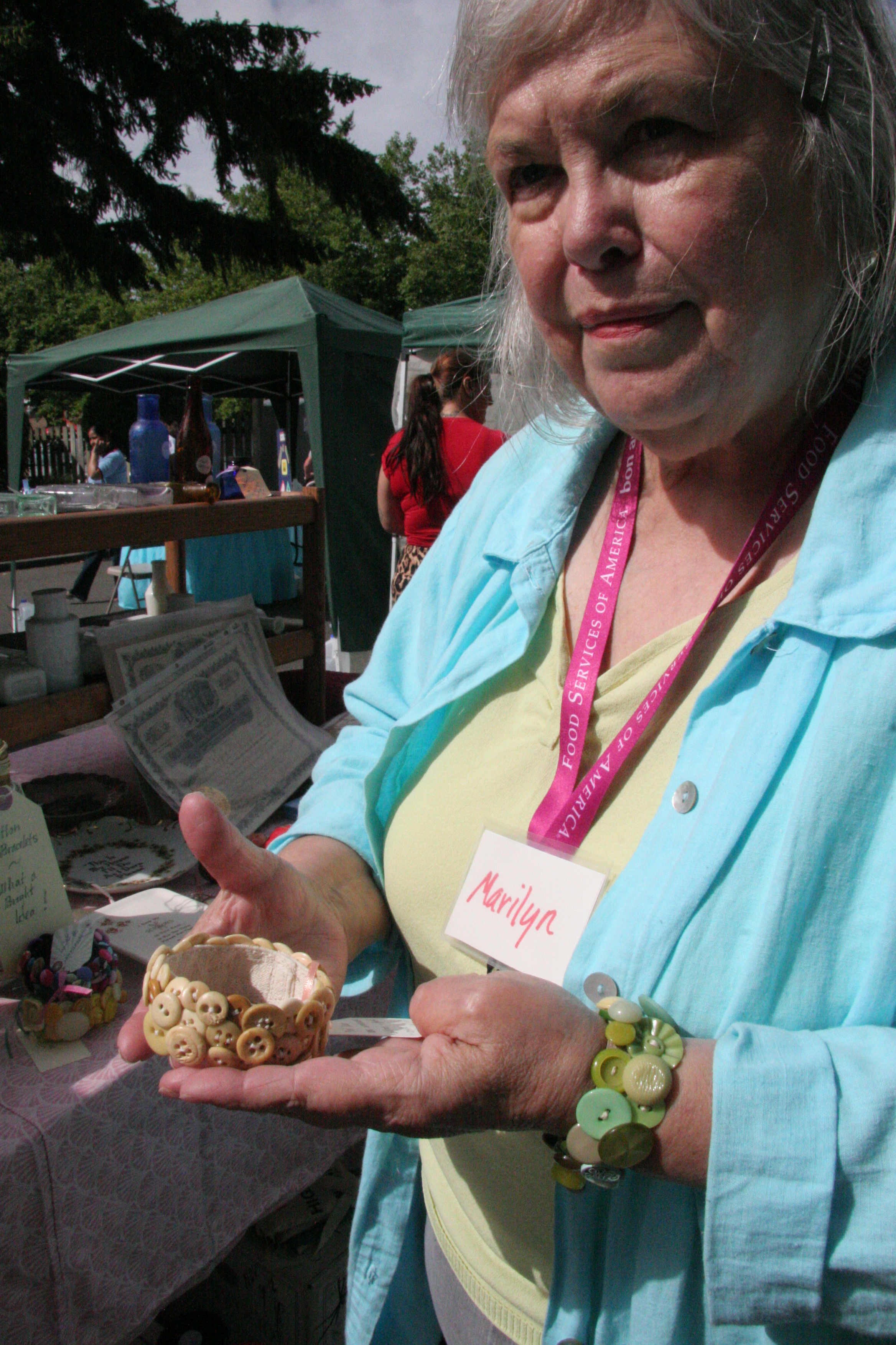 Hisen was selling bracelets made out of buttons. She has been doing this for 15 years.