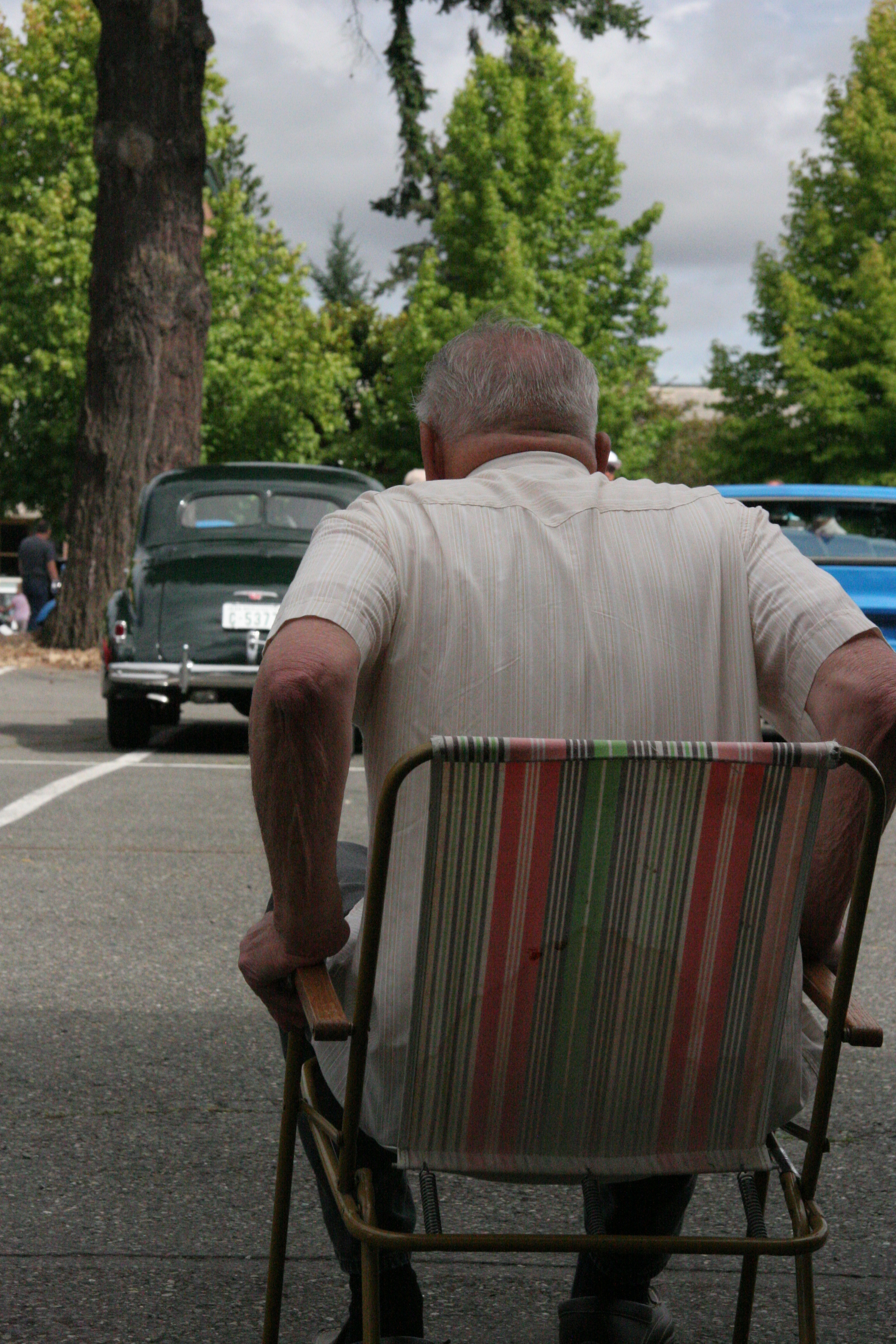 During the car show happening on Garfield street, I found a man sitting way behind his car.