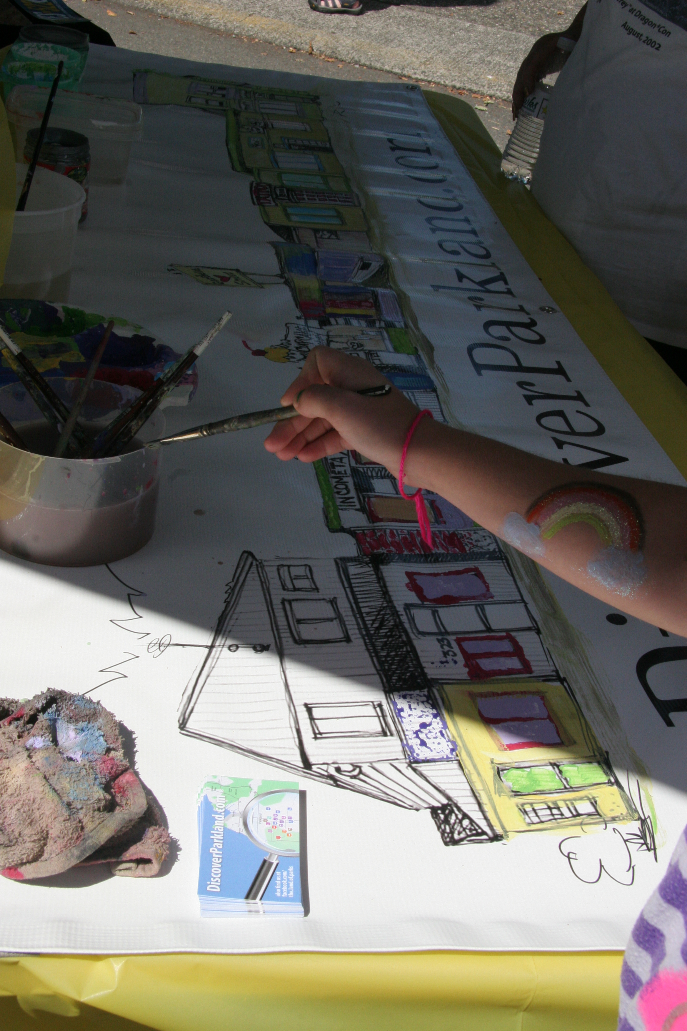 He was invited to help out the booth set by Discover Parkland. He stopped me when I passed by and asked gently, “would you like to add one color onto this picture of Garfield Street? Pick any colors you want!”