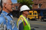Several locals were standing on the sidewalk on the south side of the street taking photos as the demolition was proceeding. Among them, the father of the man running the trackhoe, Todd Goodner. Goodner would occasionally turn toward all the cameras and smile. The company doing the demolition work is local, The Rhine Company. The demolition began slightly later than planned as a there was no water yet on site. As the building are taken down, water is sprayed to keep the dust down.