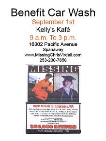 On September 1 at Kelly’s Kafé in Spanaway at 163rd & Pacific Ave., volunteers will be out washing cars to raise money. The funds are used to print flyers and other expenses associated with raising awareness of Chris’ case. The Virdell family is trying to reach out int he community to find people who may have seen him or know what might have happened.