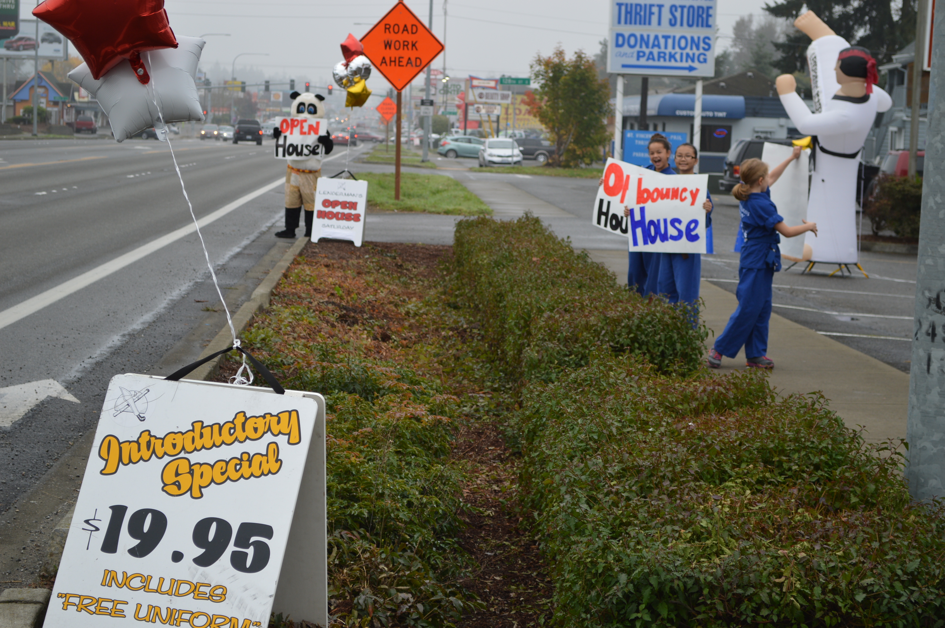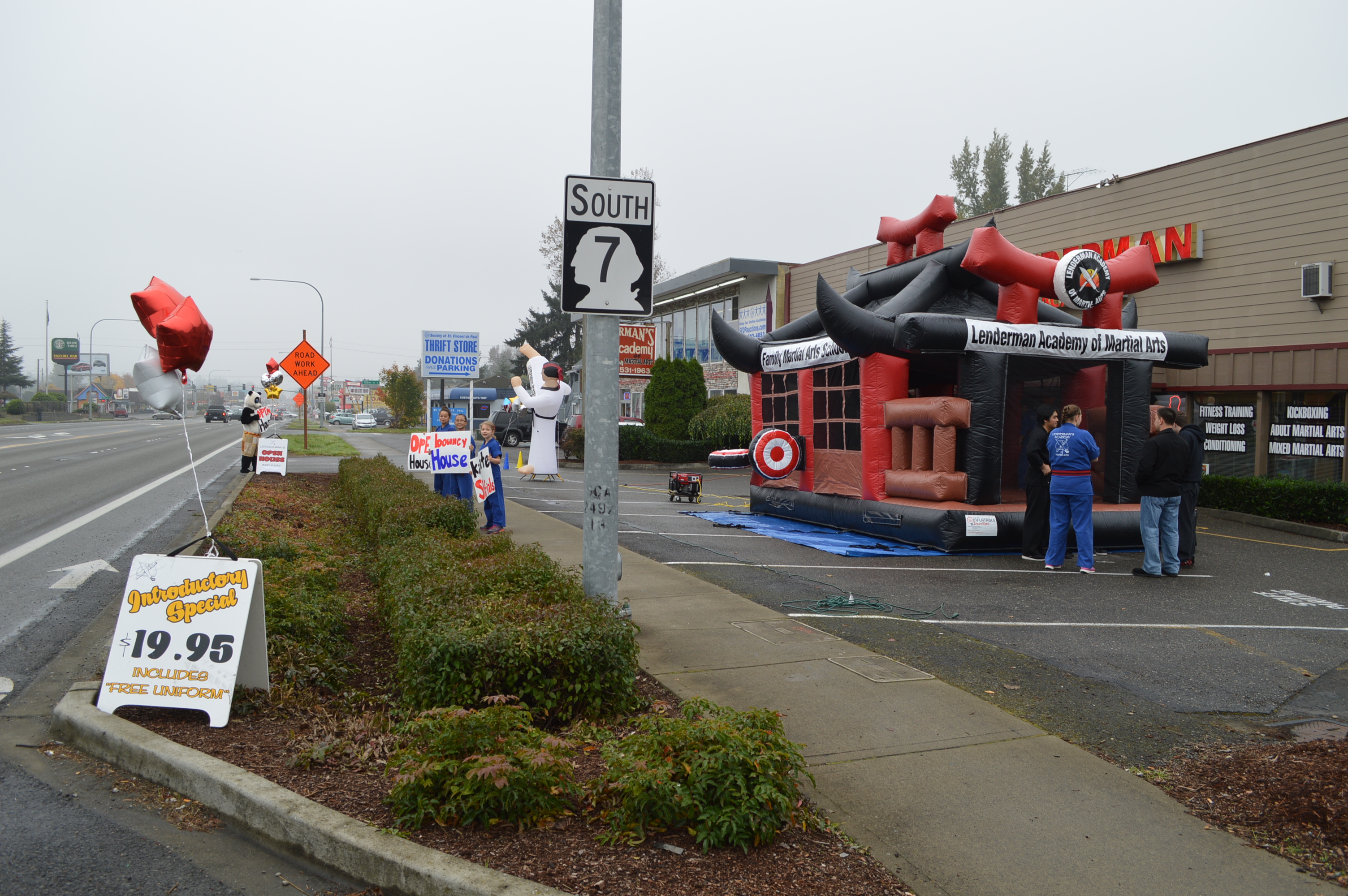 Along with the panda was a crew of kids in their blue Lenderman Gi’s waving signs saying, open house, bouncy house and karate specials. Inside there were greeters, a big bowl of Halloween candy and people being signed up at the front desk.