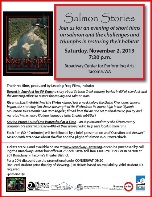 Salmon Stories, an evening of short films on salmon and the challenges and triumph of restoring their habitat in Tacoma, November 2nd 7:30 p.m. at the Broadway Center for Performing Arts in Tacoma.
