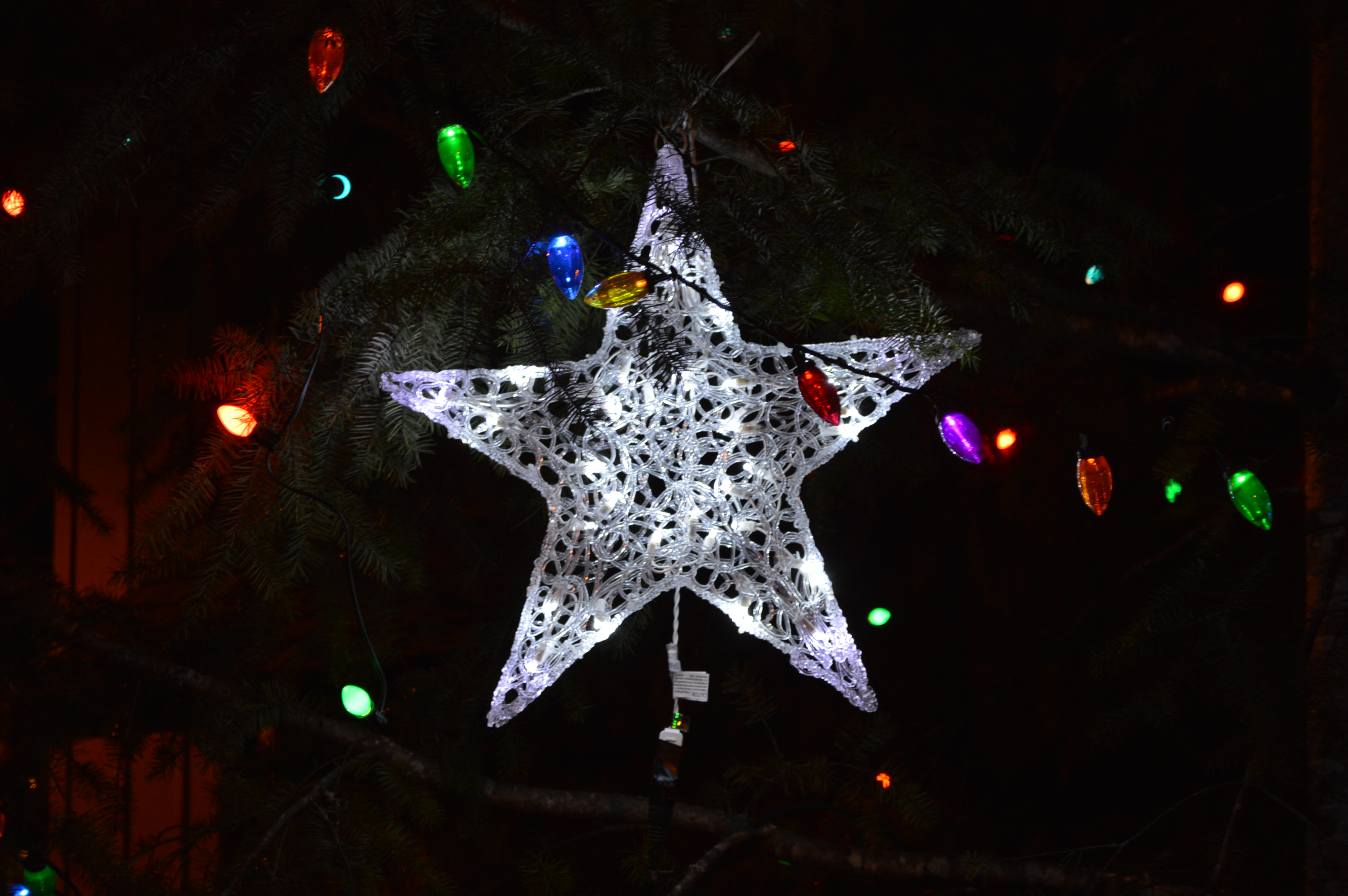 On exiting the building, people picked up candles for a candlelight vigil while singing several carols beside the unlit tree. Then, after a chorus of O Christmas Tree, the tree lit up. In the middle of it was a large, silver star. The City of Roy put it there in honor of Mr. Green.