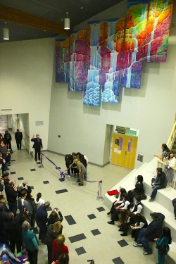 The school’s public art project was also officially dedicated. Entitled Illuminated Passage, the artwork consists of 300 square feet of die painted silk. The eleven, brightly colored panels are suspended off the wall by stainless steel brackets and accented by a light effect that looks like sunlight reflecting off of a rippled water surface.