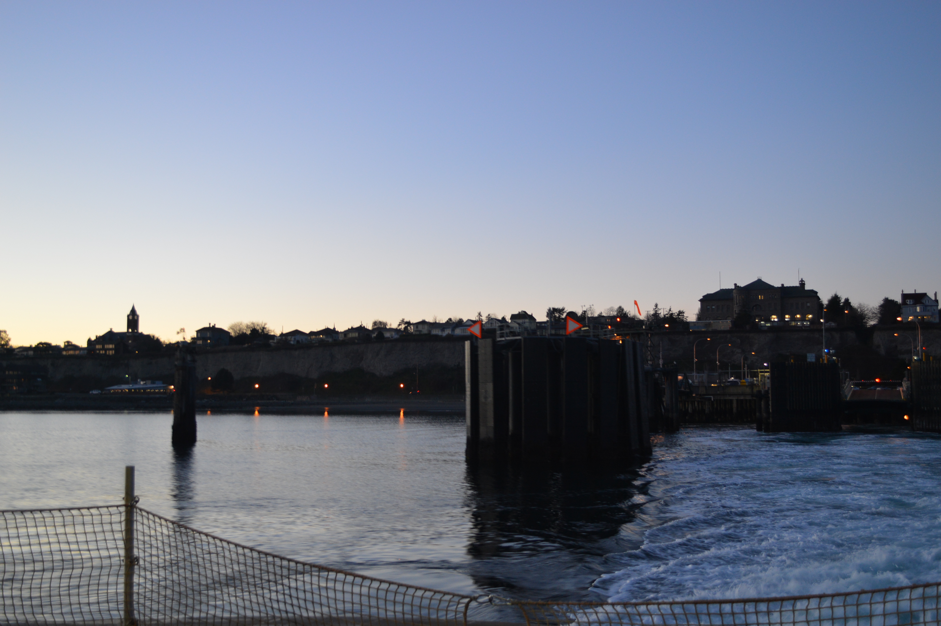 Once I boarded the Port Townsend ferry to Coupeville, Whidbey Island, the setting sun made a spectacular show in the clear night sky. The day began with some fog that cleared around noon and the January weather approached 50 degrees at its peak. There was some smog in the sky from the stagnant air, and it was magnificent for bending light at sundown. The dark blue water contrasted with a bright orange glow on the horizon that faded to gold then back to deep blue in the sky.