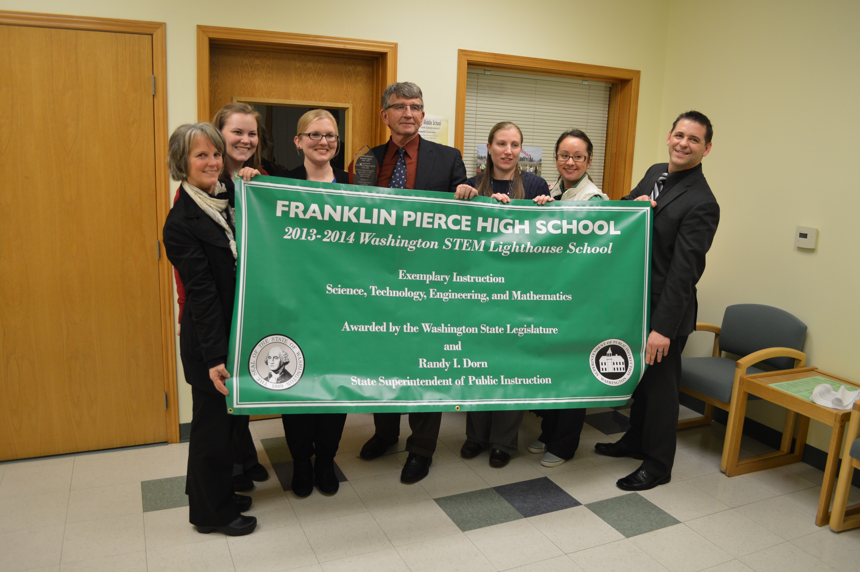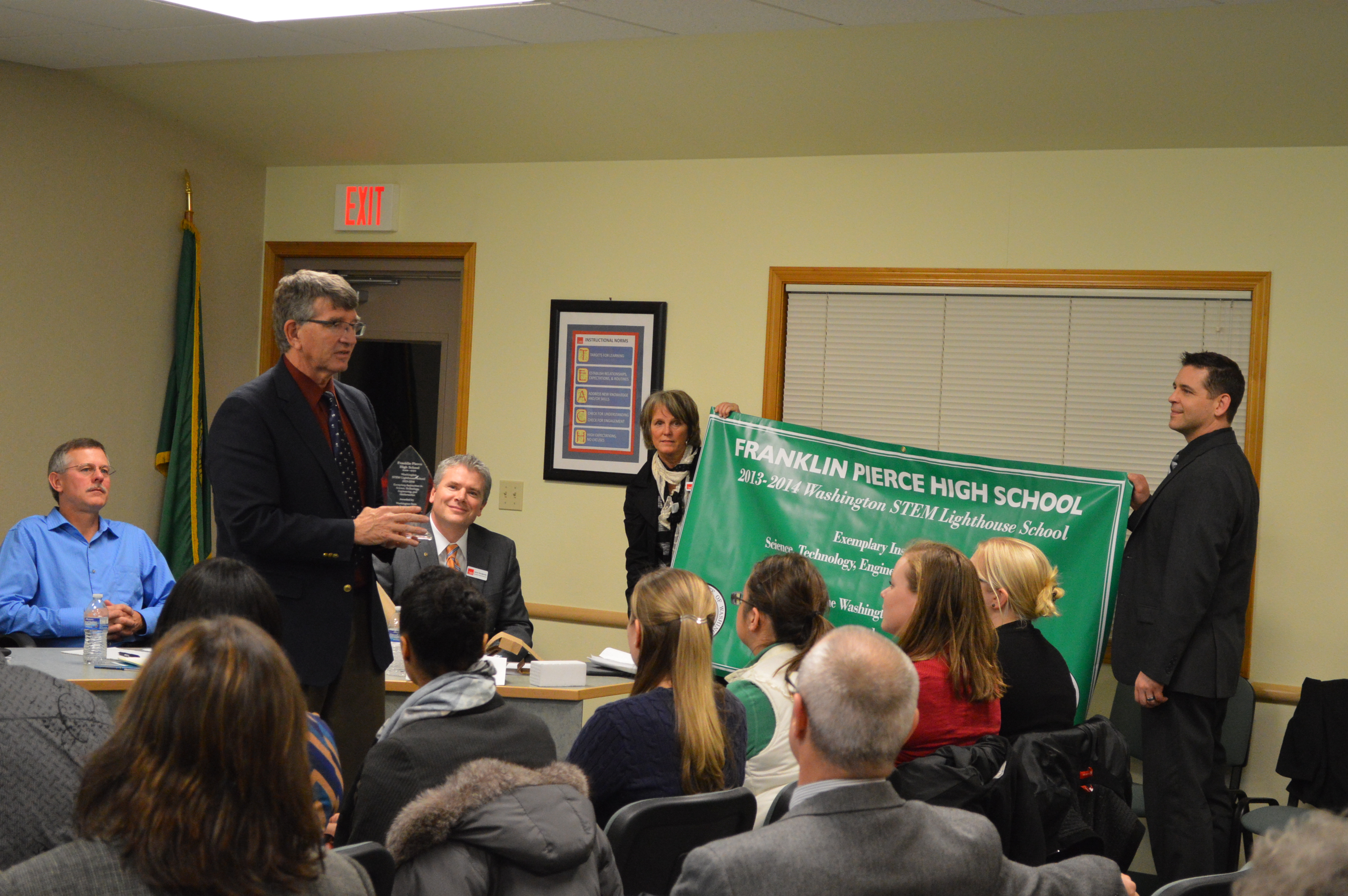 On Tuesday, February 11, The Washington State Superintendent of Public instruction Randy Dorn visited the Franklin Pierce School District  during their school board meeting to present the School Board with an award indicating the selection of DSC_4587Franklin Pierce High School as a STEM Lighthouse recipient. FPHS won the STEM Lighthouse award of $18,000 for being an exemplary example of how STEM is being taught at the high school level. As part of the grant, FPHS will be required to help other schools in other districts integrate STEM into their courses.  The board meeting was held at the Jo Anne Matson Administrative DSC_4596Complex (315 129th St S). OSPI has not yet sent out a press release concerning this year’s STEM Lighthouse recipients.