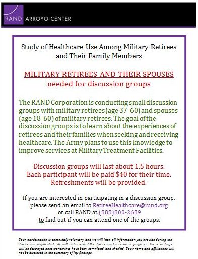 If you are a military retiree or spouse of a military retiree and under the age of 60 you are likely eligible to participate. The discussions will last about 90 minutes and participants will be paid $40 for their time. Please call the RAND research team at (888)800-2689 or email them at RetireeHealthcare@rand.org for more information.