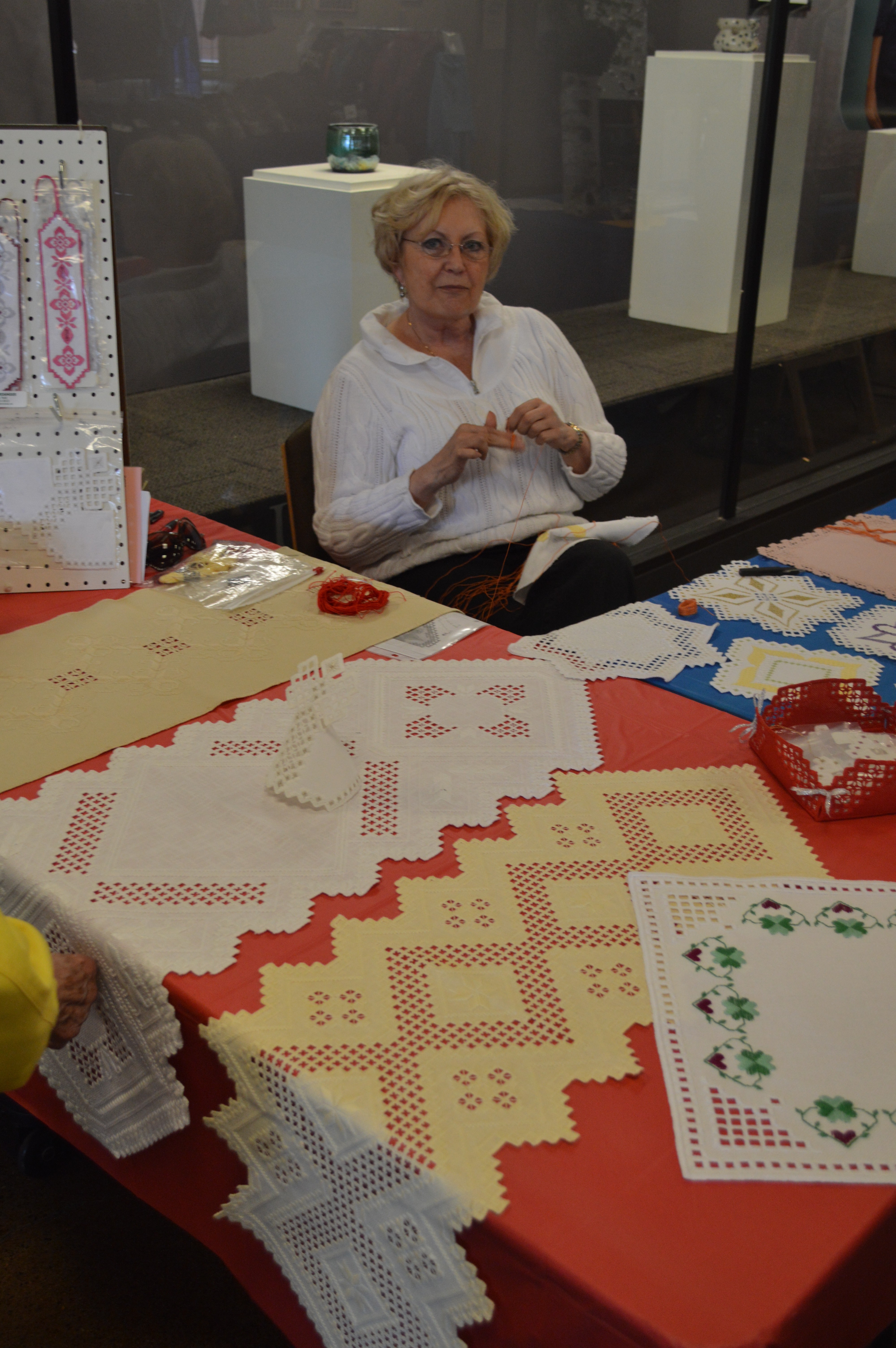 Edda Todd demonstrates her amazing skill at Hardanger embroidery; this involves cutting out single threads to make up a specific pattern. Edda has taught classes in this technique at the Scandinavian Cultural Center several times.