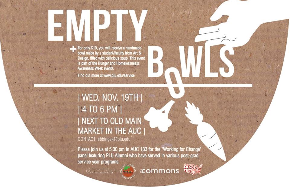 For only $10, you will receive a handmade bowl made by a student/faculty from Art & Design, filled with delicious soup. This event is part of the Hunger and Homelessness Awareness Week events. Please join us at 5:30 pm in AUC 133 for the “Working for Change” panel featuring PLU Alumni who have served in various post-grad service year programs. Find out more at www.plu.edu/service