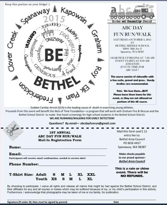 The Bethel Area Council is hosting the Fun Run/Walk event. You can submit questions at abcdayfunrun@gmail.com. Entry fees are to be mailed with the registration form to Bethel Area Council, PO Box 4457, Spanaway, WA 98387.
