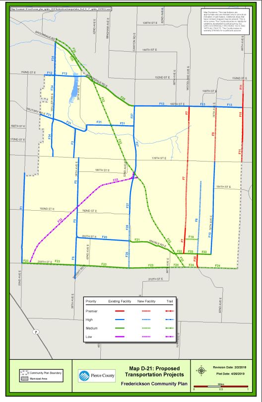 So you look at the chart from the Frederickson Community Plan. In the lower right corner is 208th Street with a dashed line. This indicated it will be dropped down over the hill, across the oxbow that fills with water like a lake in many winters, then crosses private property that they will have to condemn using eminent domain, over Eustice Hunt Road and past Liberty Middle School. Did that make sense? I will post a photo or two here. The plan appears to have 208th connect to 86th Avenue, so apparently 86th will eventually go through all the way to 112th Street.