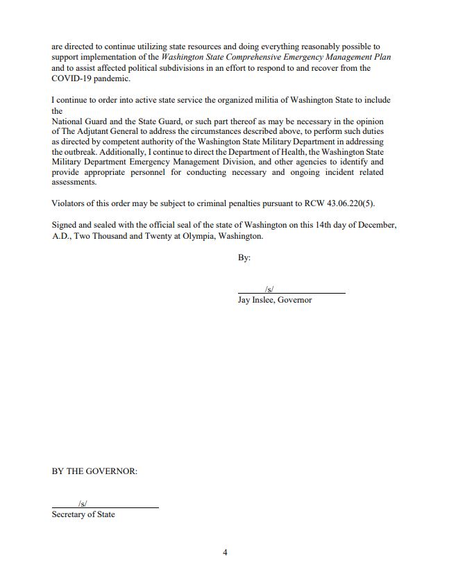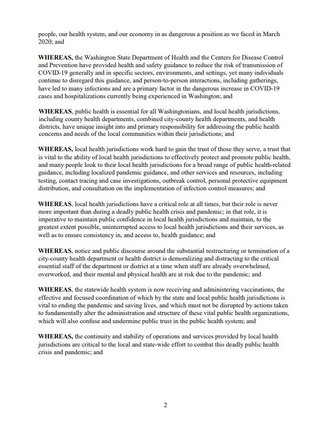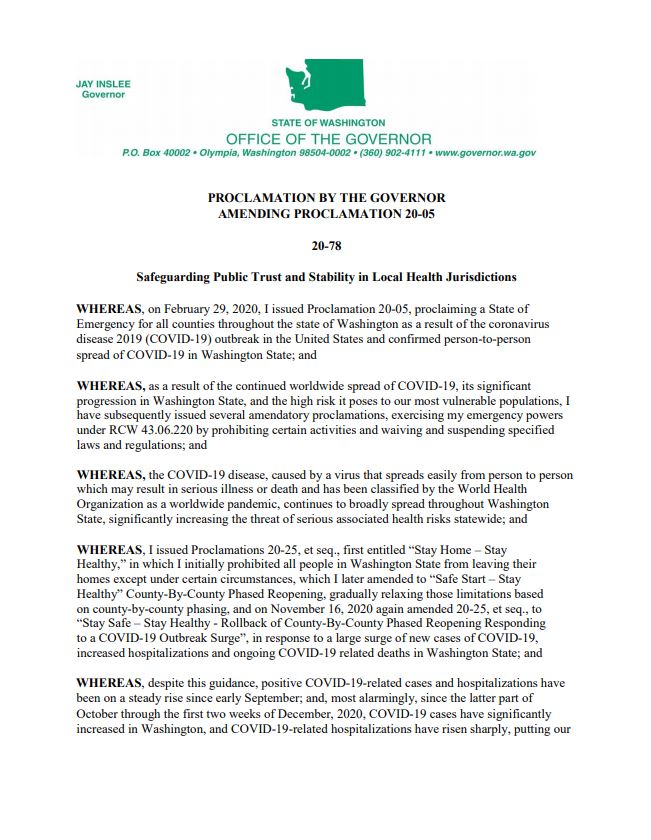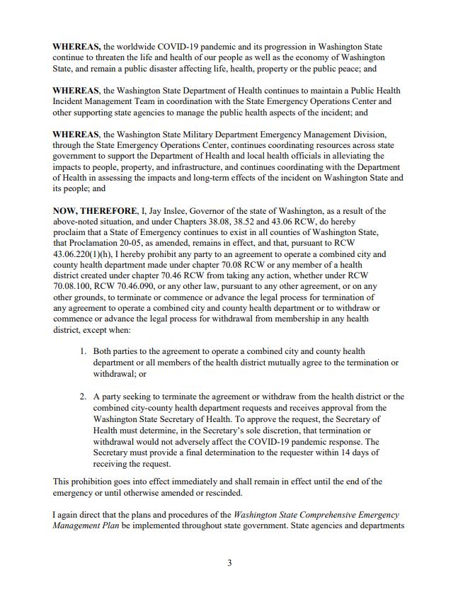 Monday evening (12-14-2020), Gov. Inslee sent out a proclamation condemning any action of a local government to dismantle a Health Department partnership during the timing of the emergency actions about the pandemic. Citing Revised Code of Washington, his proclamation: