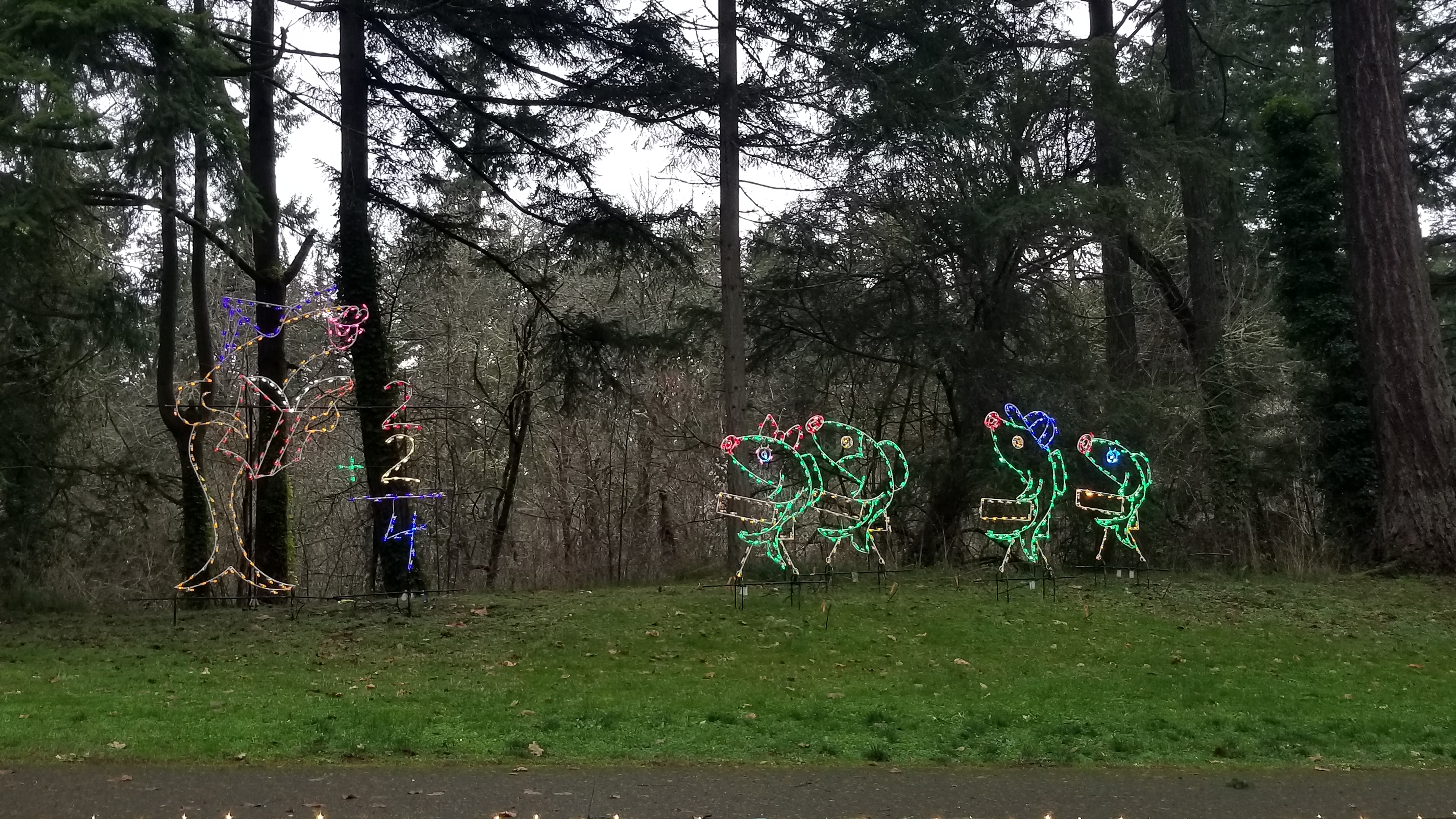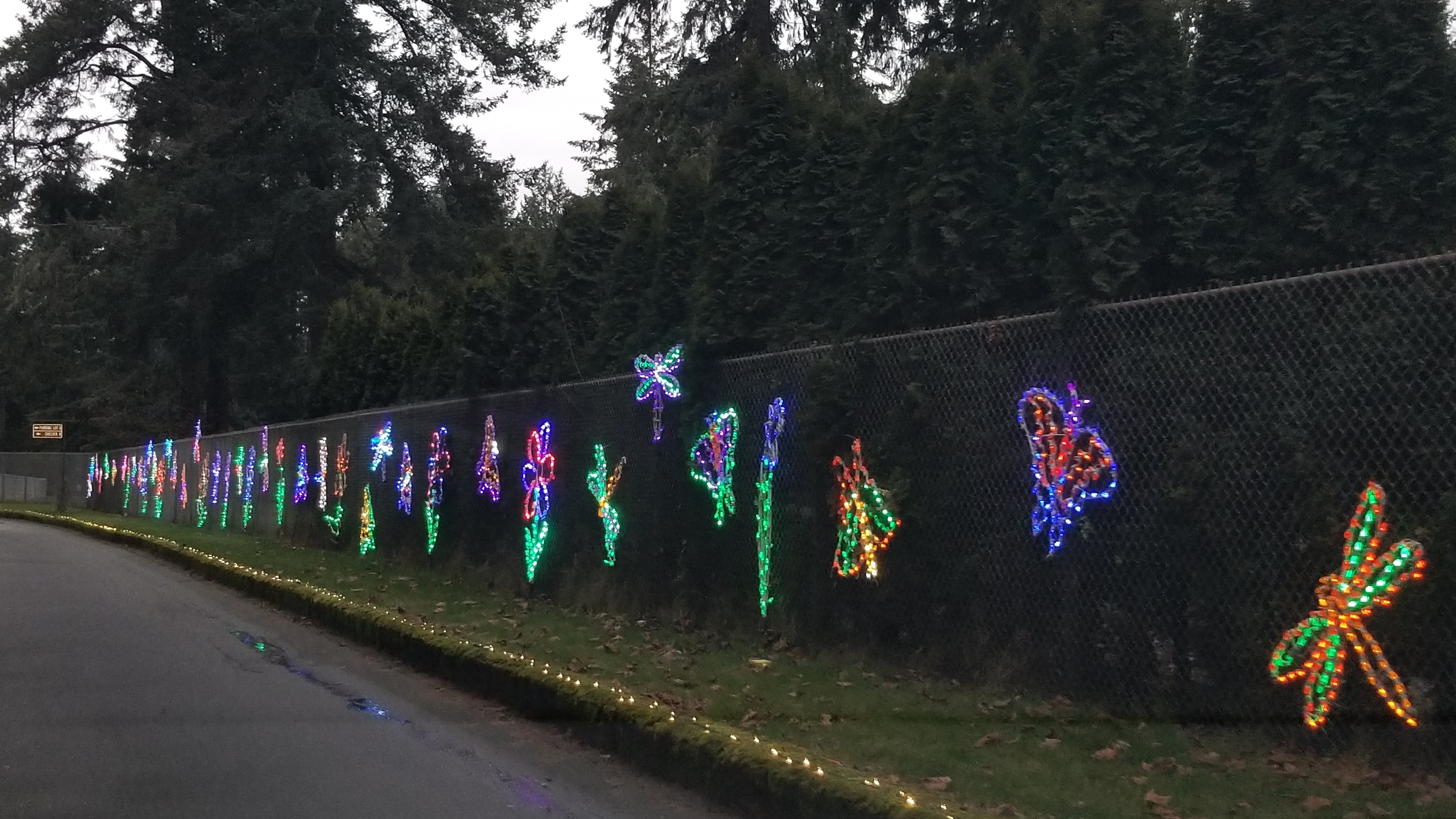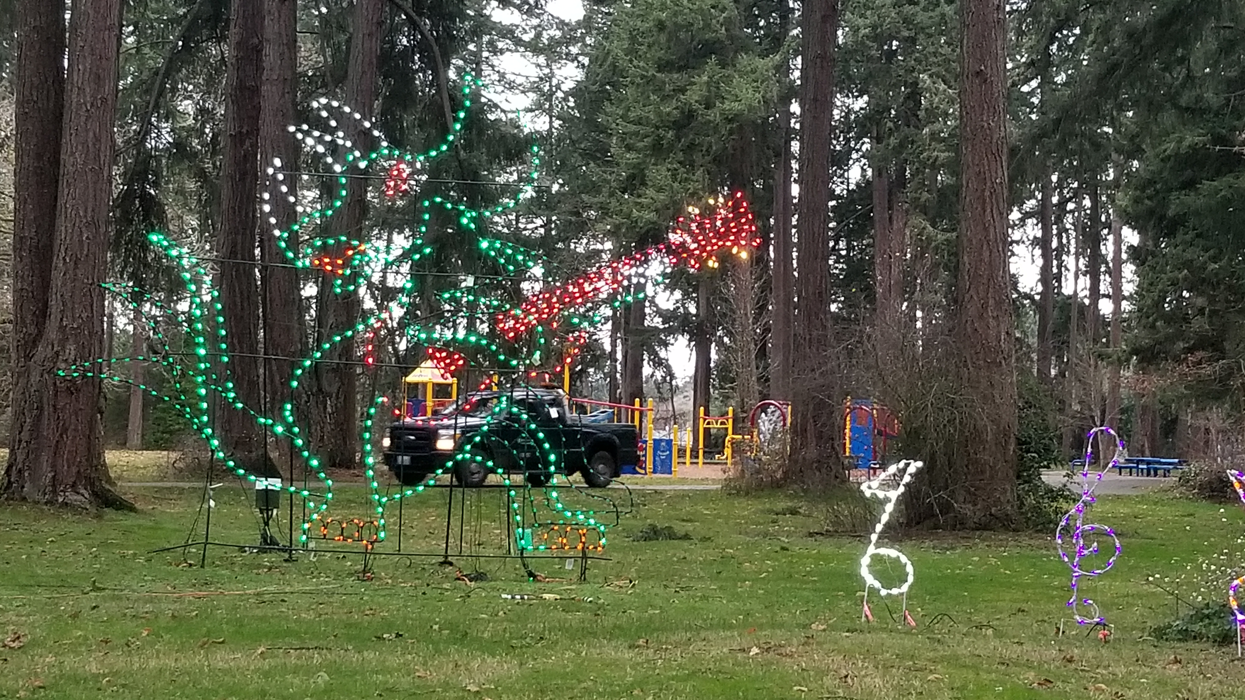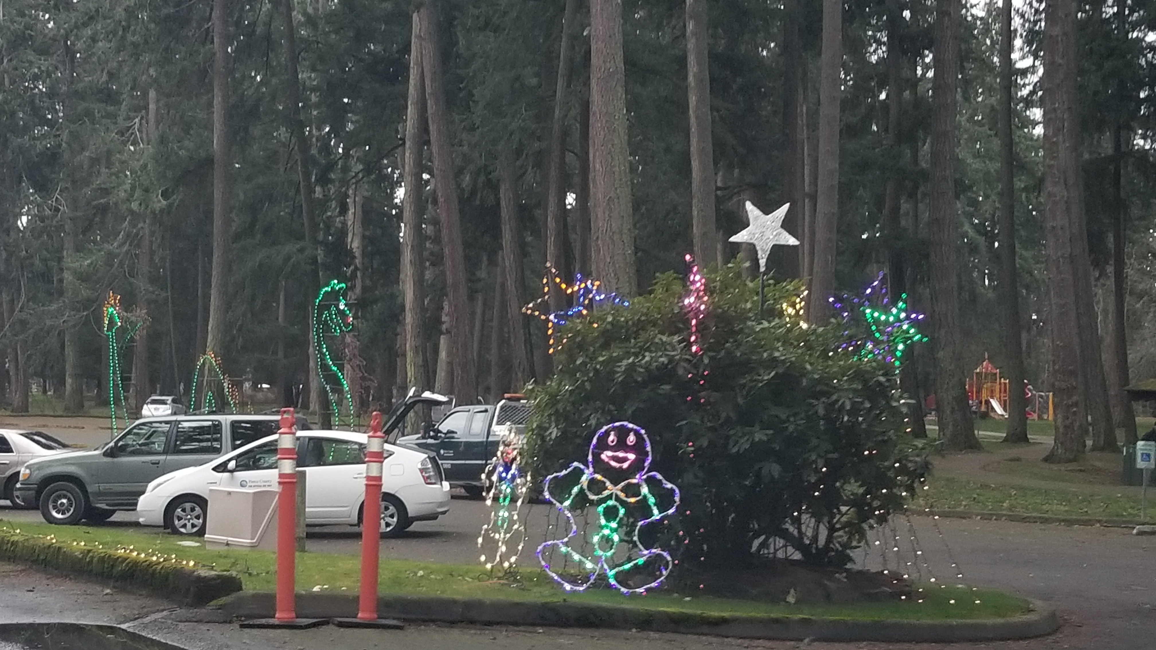 Spanaway Park Fantasy Lights have been taking up space and locking the south gate of the park for years now. Since it is the only public park in Spanaway, the County leaves the north entrance open for daytime use, but closes it just before dark. If you are there around 3:00 p.m., you can watch as the lights magically begin to come on. By dark, the parks employees will ask you to leave.