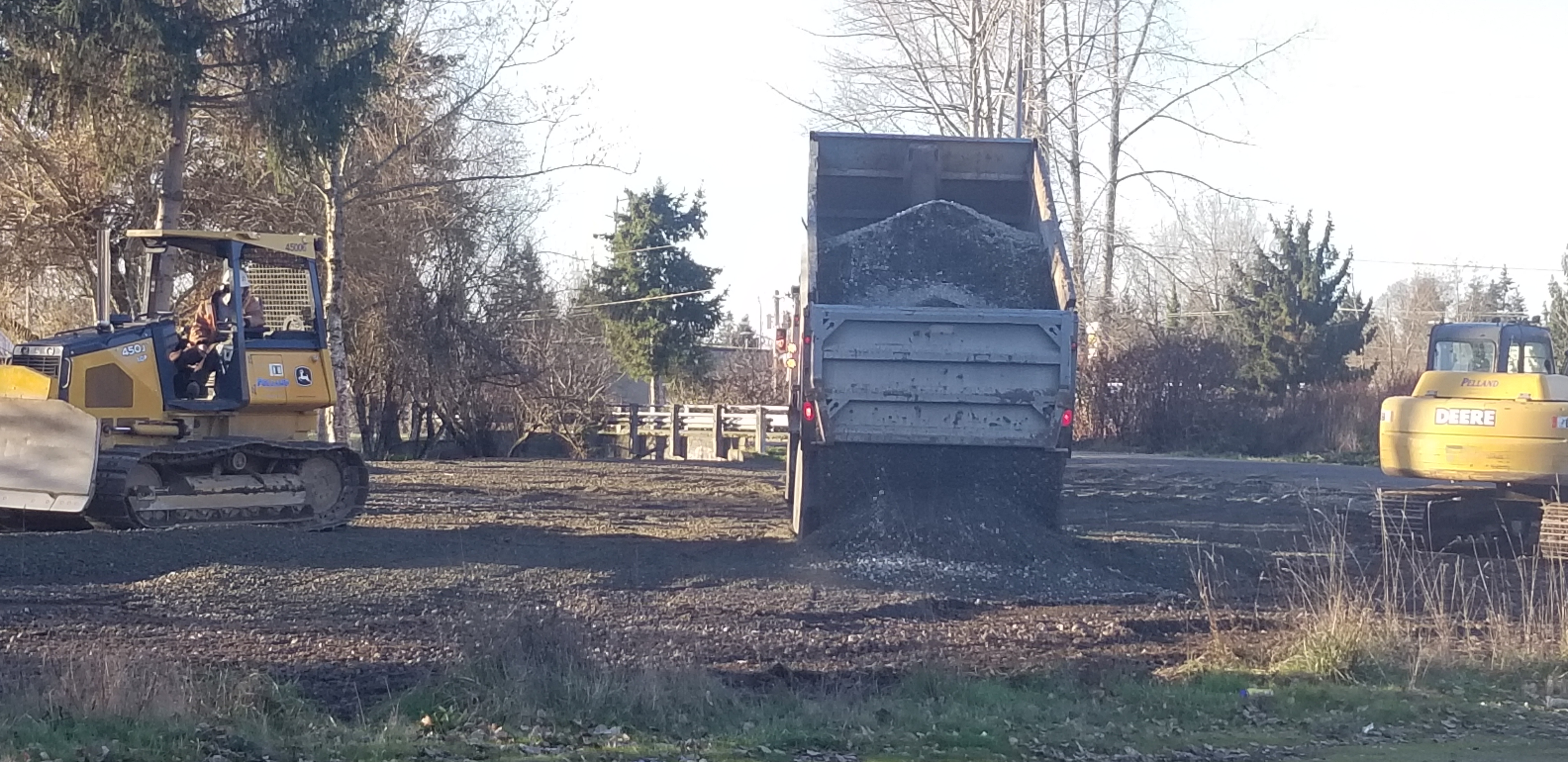 Gravel being poured on lot on the edge of Clover Creek to become a car impound lot