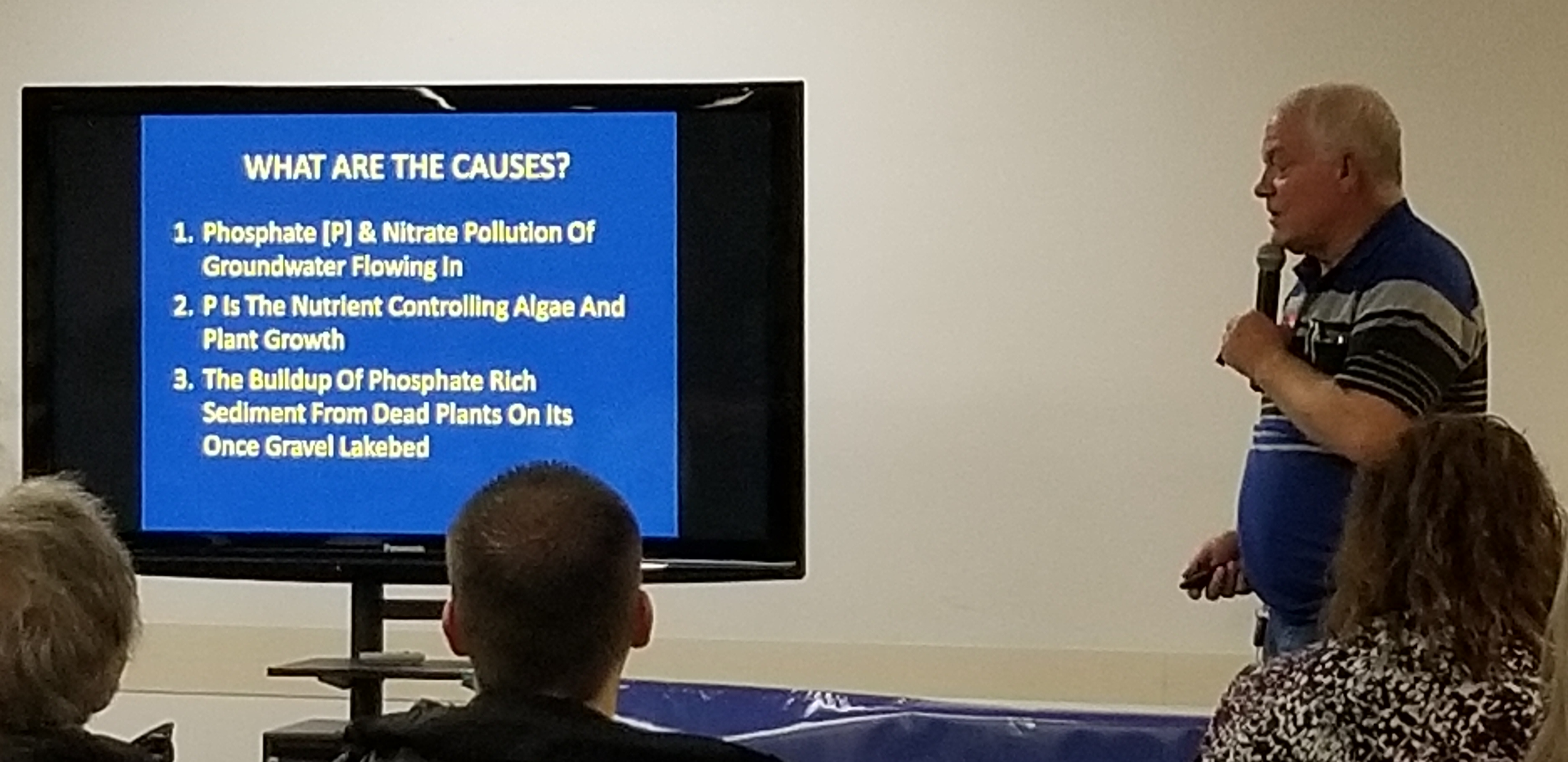 According to Lakefront owner Jessie Richards, FOSL learned quite a lot of detail about the lake from the 2015 State Study Rep. Sawyer initiated. From the findings, they knew that phosphates leaching into the lake from over a 1,000 septics to the south and east, were a major cause of the toxic algae bloom. Coffee Creek has considerable iron, but not much phosphates. It is the Southeast, shallow part of the lake where springs are coming up underneath the water with considerable phosphate contamination. The group has been experimenting with the addition of iron in that area to combine the phosphates to stop feeding the algae. Additionally, the phosphates also feed aquatic plants, which would also be restricted by chemically tying up the phosphate.