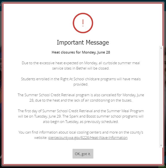 The Bethel School district is not offering its free lunch program out of concern for people being out in the extreme heat on this record heat wave day. The program will resume on Tuesday, June 29.