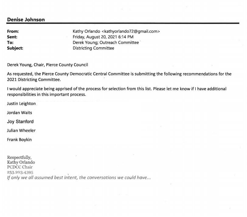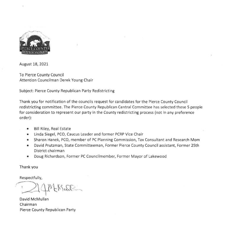 Tuesday, August 31 Sept. 7, 2021 3pm meeting, the County Council will select the members of the County Redistricting Committee 2 each from lists from Republicans & Democrats. The 5th is chosen by those four at the first meeting. Here we go… The final Council hearing will be held in Room 1045, County-City Building, 930 Tacoma Ave S, in Tacoma. Meetings are held in hybrid format with in-person and remote attendance. To attend and/or comment remotely call 253-215-8782 and use Web ID 976-6178-7423, or use Zoom link https://piercecountywa.zoom.us/j/97661787423. Find meeting schedules, agendas and legislation at piercecountywa .gov /council.