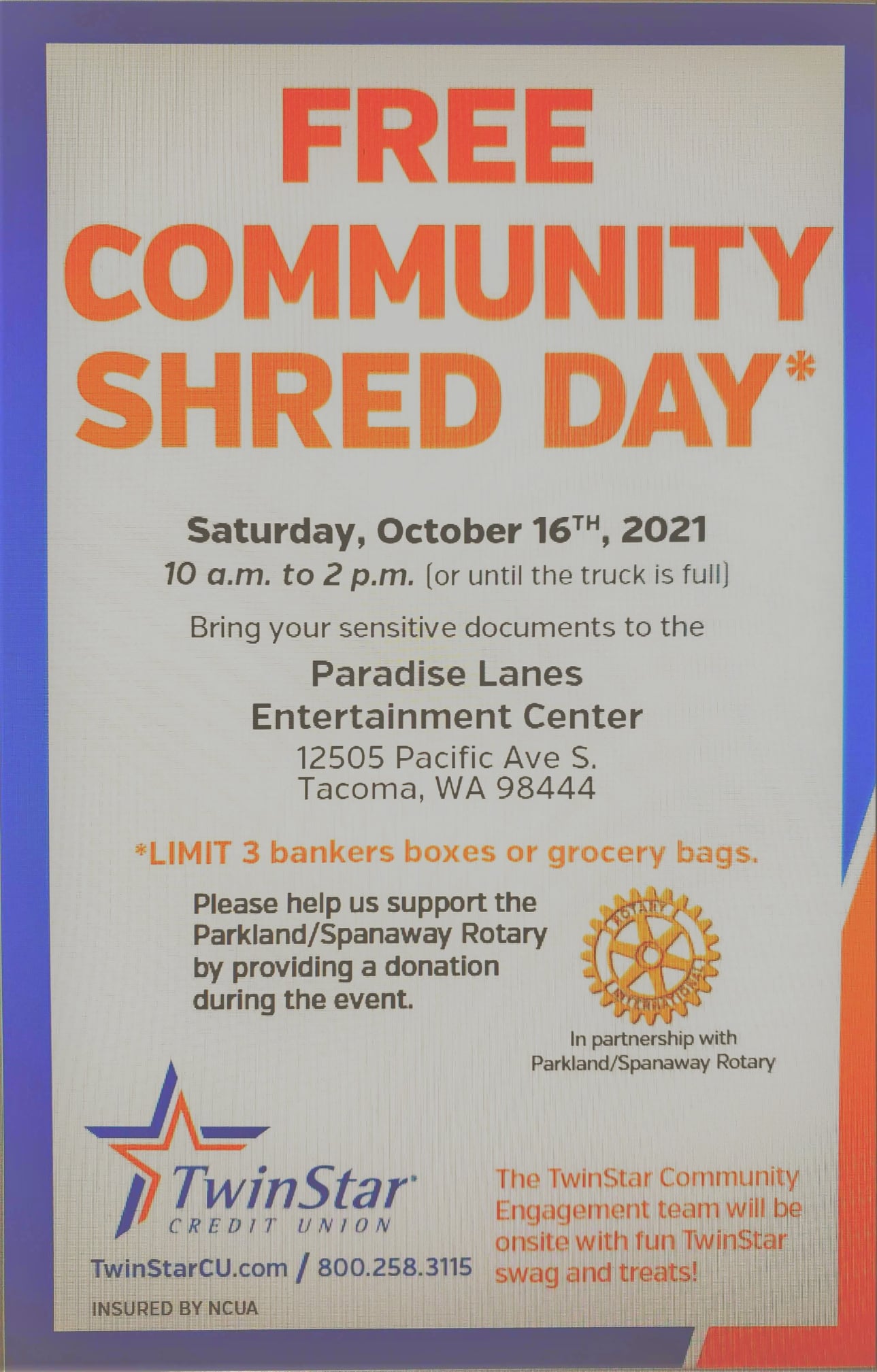 The Parkland Spanaway Rotary Club(FB/webpage) will host on site document shredding event Saturday, October 16, from 10 am – 2 pm, at Paradise Lanes and Entertainment Center (12505 Pacific Ave., Tacoma, WA 98444).