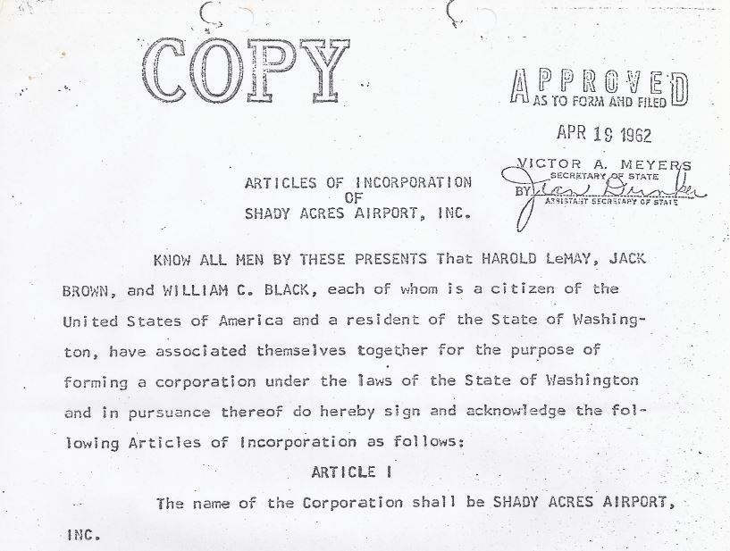 On April 19, 1962, Harold LeMay, Jack Brown and William “Bill” Black filed the Shady Acres Corporation at the State of Washington Secretary of State’s Office. It started as a piece of property on 208th Street. George Brown Road (46th Ave.) ran through the middle of it diagonally. The three subdivided the property and sold 2.5 acre parcels to pilots to build their homes and hangars together and live where they could fly from their own back yards. In subsequent years, Covington, Eatonville, Yelm, Kapowsin and Sequim also sprouted residential airparks.