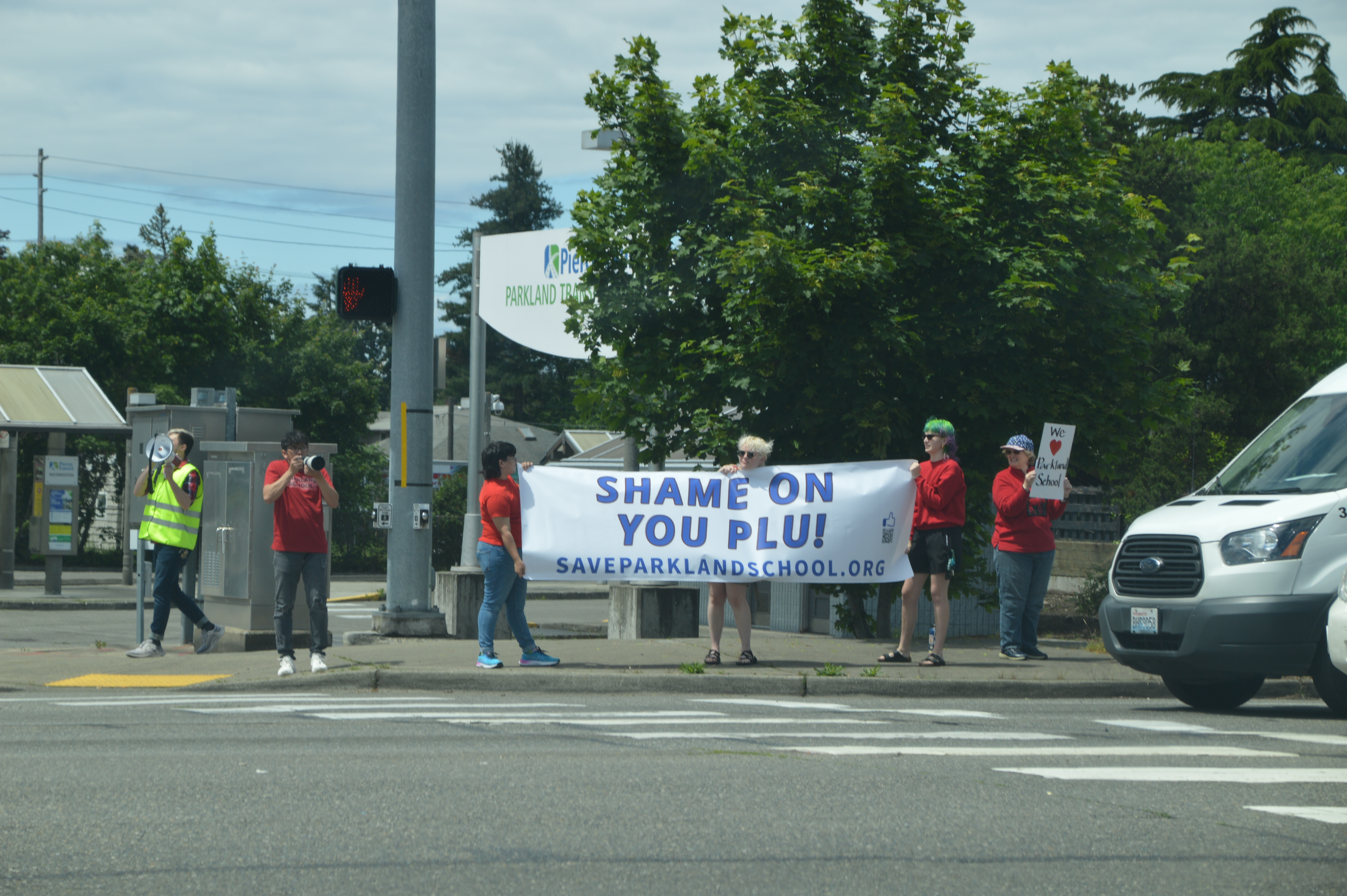 Saturday, June 11,2022, from 1 to 3 p.m., citizens of Parkland, Washington are waving signs and banners on Pacific Avenue at the corner of Pacific Avenue and 121st Street in protest of Pacific Luther University’s plans to un-list it as a state historic site and sell it to a developer who plans to demolish if doe a high-rise apartment complex.