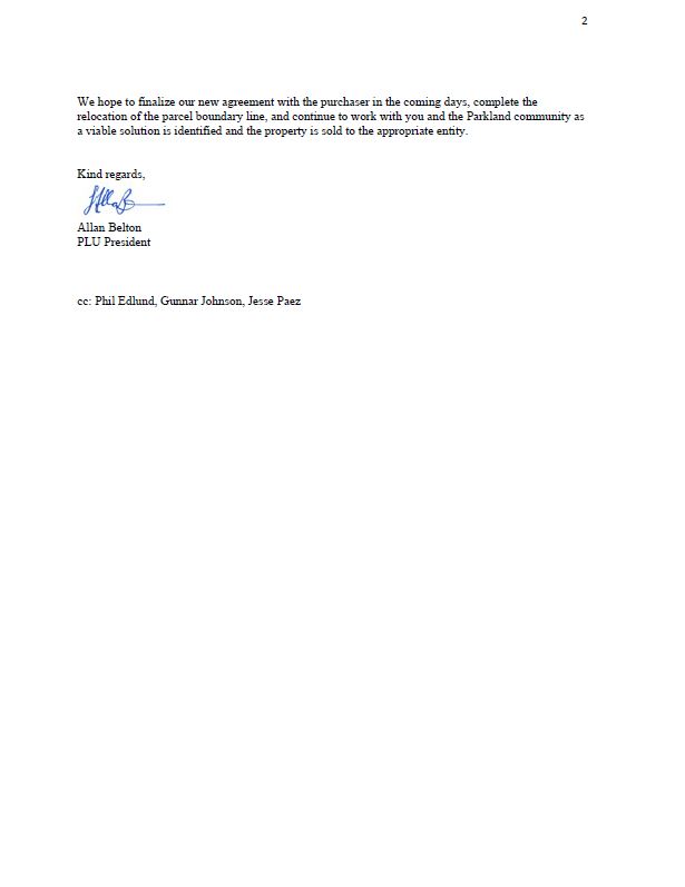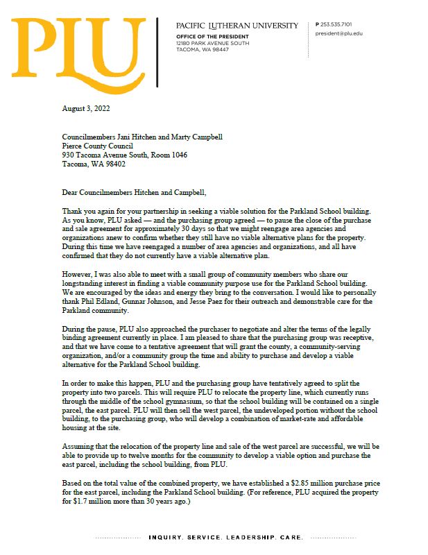 In a recent letter to two members of the Pierce County Council, Pacific Lutheran University president Allan Belton has agreed to sell Parkland School for use by the community. In his letter, Belton set a price of $2.85 million and wrote that a property transfer needed to develop apartments will be delayed for one year.