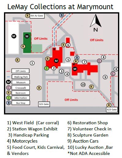 Car clubs must pre-register to bring club vehicles by calling (253) 272-2336 or by email: info@lemaymarymount.org