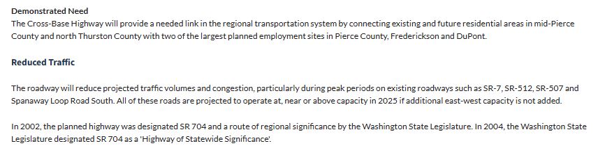 This project would essentially put a ground lock on transportation alternatives in the Spanaway community. Spanaway Loop Road is over capacity and the Cross Base was part of fixing that. North Tacoma and Seattle environmentalists don’t understand the transportation problems already created here. From SR512, it’s another 17.5 miles to a west road access point. That is Yelm. When the I-5 freeway is blocked, Yelm, McKenna, Roy and Spanaway suffer miserably from traffic overload.