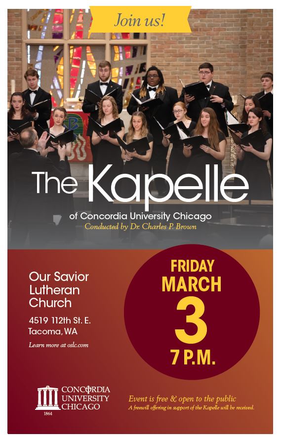The Kapelle of Concordia University Chicago under the direction of Dr. Charles P. Brown will present their West Coast Spring Tour. This select voice choir tours annually throughout the U.S. as well as internationally every four years, and records regularly. This event is FREE and open to the public. Visit oslc.com for more information.