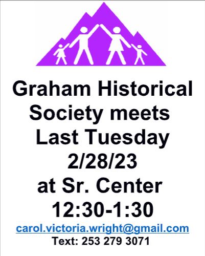 There is a Graham Historical Society, and they are trying to get back on track post-pandemic. On February 28, noon, at the Graham Senior Center in Frontier, there will be a monthly, in-person meeting. The group is not the kind of people that use Zoom or computers, many are bonafide pieces of local history themselves. So plan to show up if you want to know what is going on.