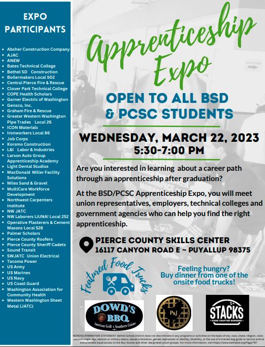 Join us on Wednesday, March 22 for our Apprenticeship Expo. The event runs from 5:30-7pm and will feature over 50 booths with representatives from unions, healthcare, IT, police agencies, construction companies and much, much more!