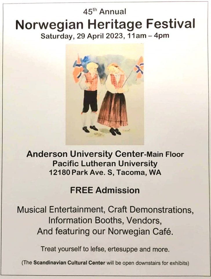 A Parkland event that is delightful to visit, called the Norwegian Heritage Festival is this Saturday, April 29, 2023. From 11 a.m. to 4 p.m., the PLU Anderson University Center will have booths with delightful Scandinavian items, Vikings, krumkake and creamy Rømmegrøt. Food, music and dancing will be had on the main floor and the hallways will be lined with various vendors.