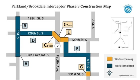 The contractor working for Pierce County originally began the project in July 2022 and resumed construction activities on July 10, 2023, after a seven-month suspension due to high groundwater levels. The project is now anticipated to be completed in October 2023.