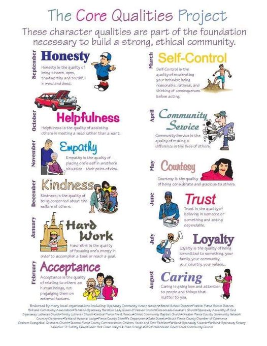 It took several years for the Bethel School District, Franklin Pierce District and the faith leaders group to come up with a list, but back in the 1990’s the Core Qualities project was brought to fruition.