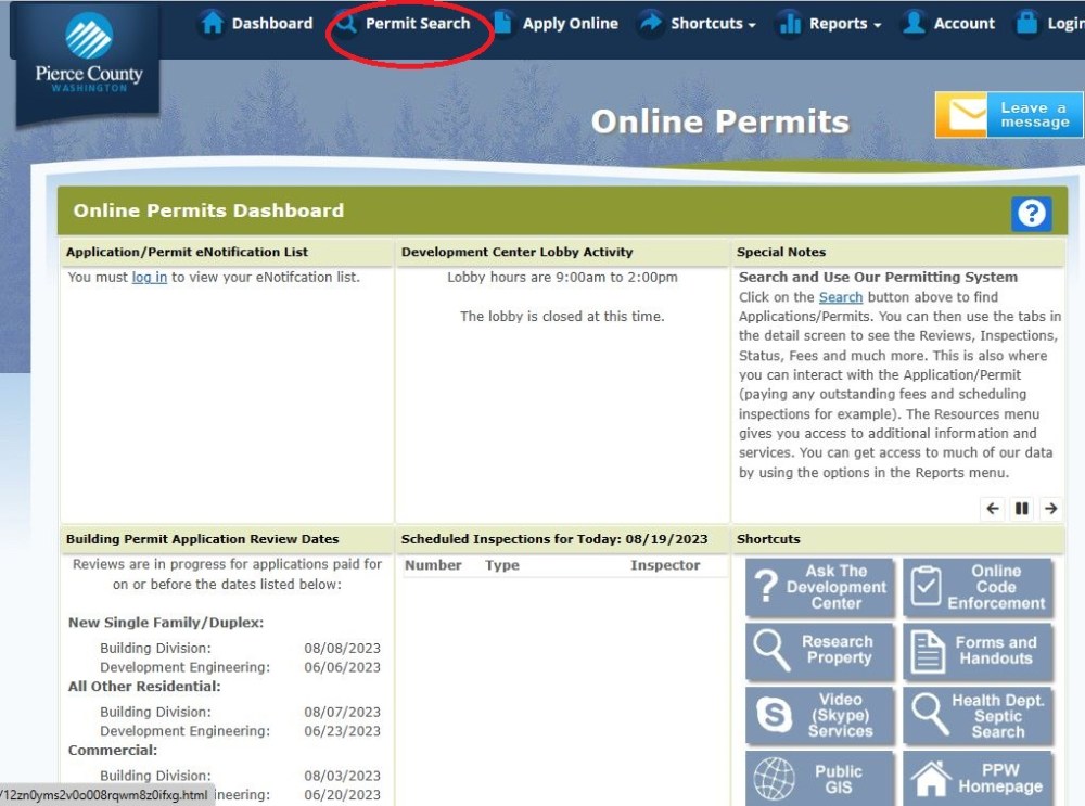 You can see there is a lot of information stored in this system. To trace the progress of a yellow sign that went up, choose Permit Search at the top of the page.
