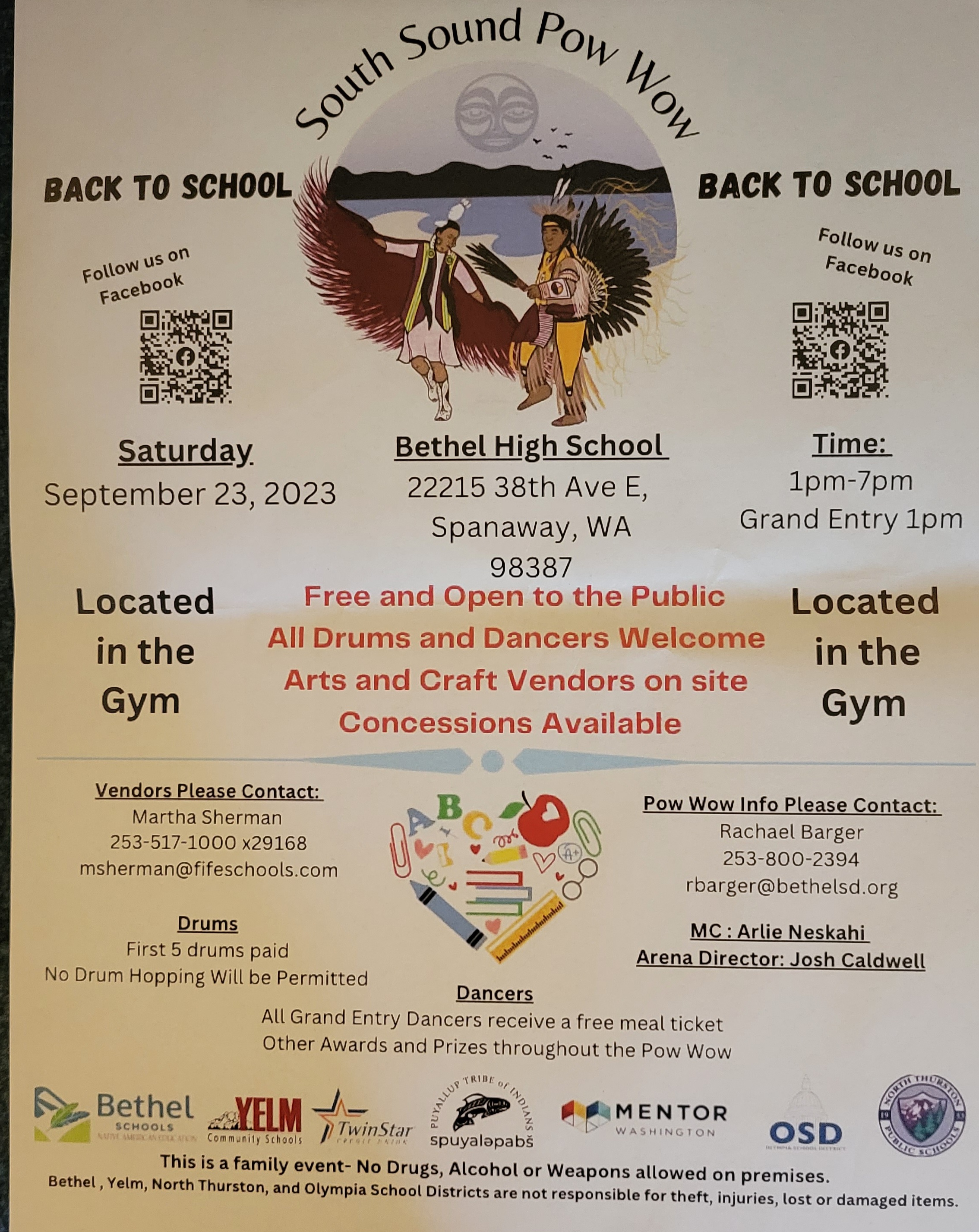 They are no longer the Bethel Braves, they are the Bethel Bison, but the commitment to the area’s diversity and origin is there. On September 23, from 1 p.m. to 7 p.m., four school districts, Bethel, Yelm, North Thurston, and Olympia will present a back to school Pow Wow.