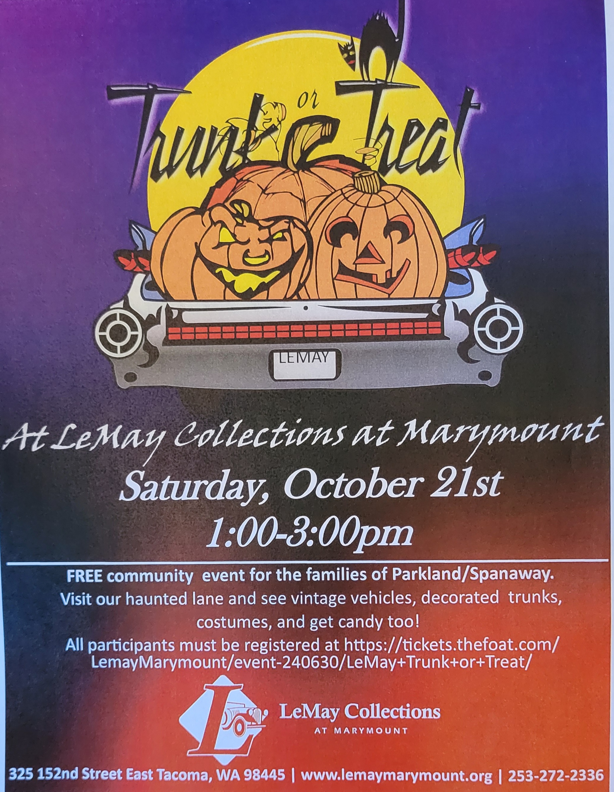 LeMay Collections at Marymount, 325 152nd St E, Tacoma, WA, Trunk or Treat (link for time slots). FREE. LeMay Collections at Marymount is hosting our annual Trunk or Treat on October 21, 2023. Calling all GOBLINS, GHOSTS & SUPER HERO’S! This event will happen rain or shine, ALL VEHICLES MUST BE REGISTERED to enter the HAUNTED LANE. Time slots will be assigned on a first-come, first-served basis. All visitors dressed in costume on this day will receive HALF_OFF admission to self-guided museum collection tour at Marymount.
